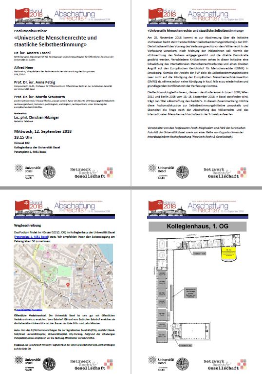 - Das Programm wurde veröffentlicht. Die Konferenz beginnt am Abend des 12.9.2018 mit der öffentlichen Podiumsdiskussion «Universelle Menschenrechte und staatliche Selbstbestimmung» (Beginn: 18.15 Uhr). Die Registrierung für die Konferenz (Ausgabe Namensschilder, Tagungsband, Kongressunterlagen) muss am 13.9.2018 zwischen 08.30 und 09.30 Uhr erfolgen. Enden wird der Kongress am 15.9.2018 etwa um 12.30 Uhr.